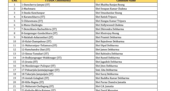 BJP to go solo, names candidates for all 28 TTAADC seats Agartala, Mar 24: The ruling Bharatiya Janata Party (BJP) on Tuesday announced… March 24, 202653 views