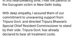 Uncategorized গুরুগ্রাম নির্যাতিতার পরিবারের পাশে থাকার আশ্বাস দিলেন মুখ্যমন্ত্রী আগরতলা, ৩ মার্চ ২০২৬ঃগুরুগ্রামে ১৯ বছরের এক ত্রিপুরার তরুণী নির্যাতনের ঘটনায়… March 3, 202645 views