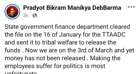 Uncategorized টিটিএএডিসি কর্মচারীদের বেতন হয় নি, ক্ষোভ জানালেন প্রদ্যোত আগরতলা, ৩ মার্চ, ২০২৬ঃমাসের ৩ তারিখ পেরিয়ে গেলেও রাজ্য উপজাতি জেলা পরিষদের,… March 3, 202627 views