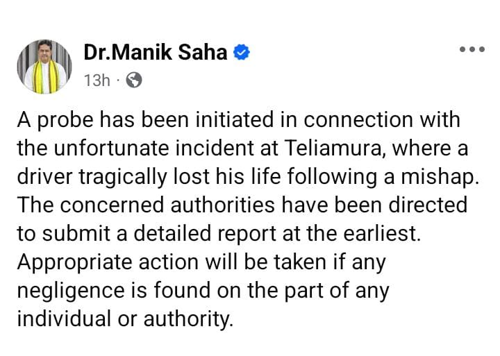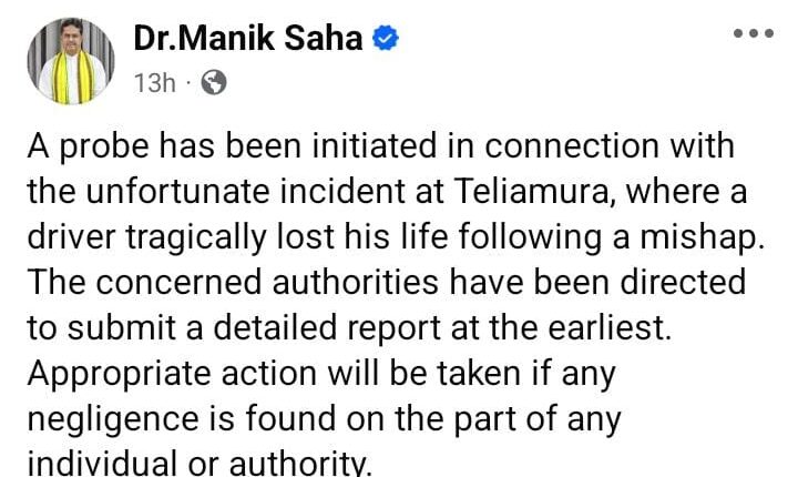 ঘটনার পর মুখ্যমন্ত্রী ঘটনার একটি পূর্ণাঙ্গ তদন্তে নির্দেশ দিয়েছেন। এদিম মুখ্যমন্ত্রী তার সামাজিক মাধ্যমে একটি পোস্ট করে লিখেন, “তেলিয়ামুড়ায় ঘটে যাওয়া এই মর্মান্তিক দুর্ঘটনার প্রেক্ষিতে তদন্ত শুরু হয়েছে। সংশ্লিষ্ট কর্তৃপক্ষকে দ্রুত রিপোর্ট জমা দিতে বলা হয়েছে। কারো গাফিলতির প্রমাণ মিললে উপযুক্ত ব্যবস্থা নেওয়া হবে।”