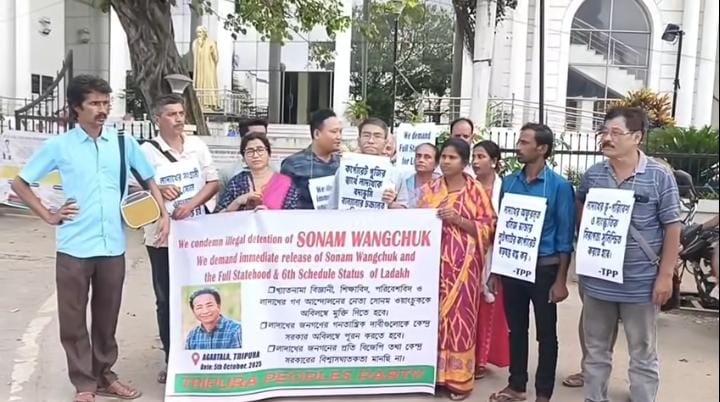 লাদাখের গণ আন্দোলনের নেতা সোনম ওয়াংচুকের নিঃশর্ত মুক্তির দাবিতে সোমবার আগরতলার রবীন্দ্র শতবার্ষিকী ভবনের সামনে বিক্ষোভ কর্মসূচি পালন করে ত্রিপুরা পিপলস পার্টি।