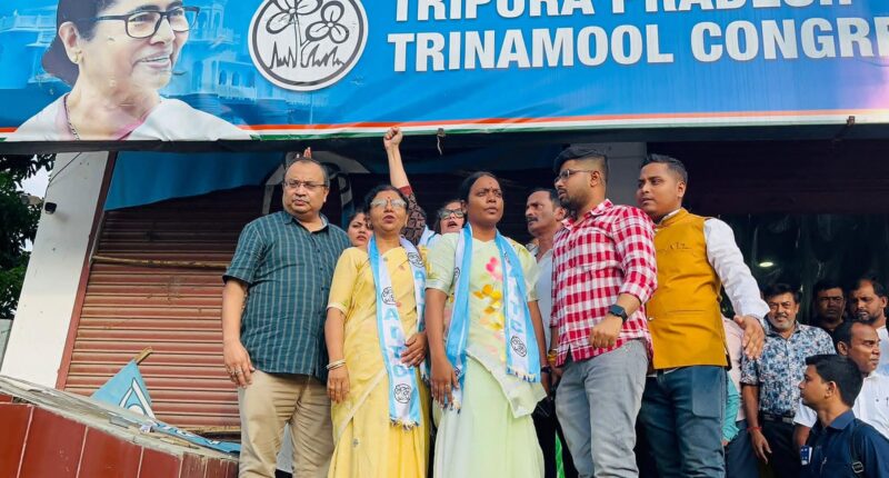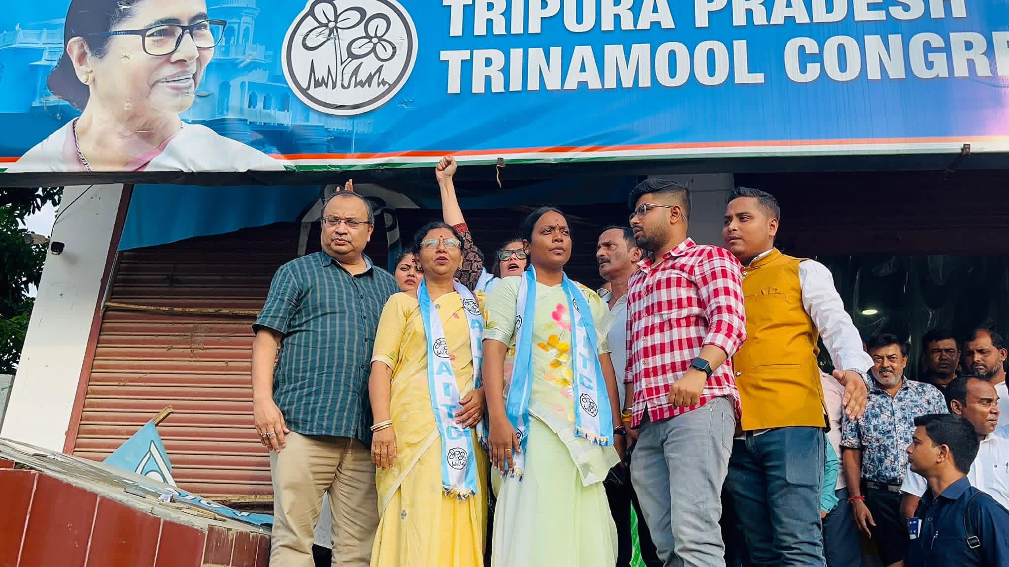ত্রিপুরায় তৃণমূল কংগ্রেসের রাজ্য কার্যালয়ে ভাঙচুরের ঘটনায় তীব্র প্রতিবাদ জানাতে বুধবার রাজ্যে সফরে আসেন তৃণমূল কংগ্রেসের কেন্দ্রীয় নেতারা। তাঁদের মধ্যে উপস্থিত ছিলেন রাজ্যের মন্ত্রী বীরবাহা হাঁসদা, সাংসদ প্রতিমা মন্ডল, সাংসদ সায়নী ঘোষ এবং রাজ্য সাধারণ সম্পাদক কুনাল ঘোষ।