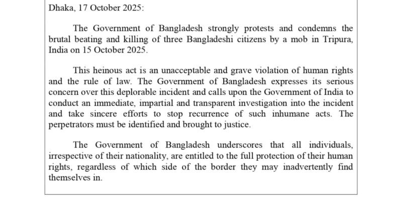 বাংলাদেশের পররাষ্ট্র মন্ত্রণালয় এক বিবৃতিতে জানিয়েছে, গত ১৫ অক্টোবর ঘটে যাওয়া এই “নৃশংস মারধর ও হত্যাকাণ্ড” মানবাধিকারের গুরুতর লঙ্ঘন। বিবৃতিতে বলা হয়, “এই জঘন্য ঘটনা কোনভাবেই গ্রহণযোগ্য নয়। অপরাধীদের শনাক্ত করে দ্রুত আইনের আওতায় আনতে হবে। যে কোনো দেশের নাগরিকই মানবাধিকারের পূর্ণ সুরক্ষা পাওয়ার অধিকারী, তারা সীমান্তের যে দিকেই থাকুক না কেন।”