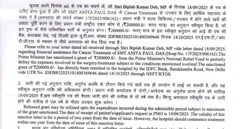 Expressing heartfelt gratitude to the Prime Minister, the MP Biplab Deb stated, “I extend my sincere thanks and deep appreciation to Hon’ble Prime Minister Shri Narendra Modi Ji for his kind approval of ₹2 lakh towards the medical assistance of Smt. Anita Pal Das. Upon receiving her request for financial aid, I immediately forwarded the application to the PM Relief Fund, and the approval came within a remarkably short time.”