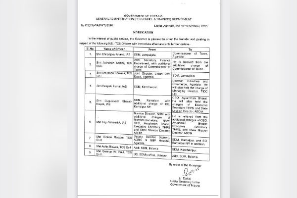 According to the order, Chiranjeev Anand, currently serving as SDM of Jampuijala, has been appointed Commissioner of Taxes, Agartala. Akinchan Sarkar, Additional Secretary in the Finance Department, has been relieved of his additional charge as Commissioner of Taxes.