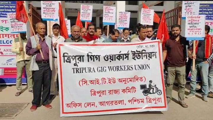 ত্রিপুরা গিগ ওয়ার্কার্স ইউনিয়নের উদ্যোগে সোমবার আগরতলার অফিস লেন এলাকায় অবস্থিত শ্রম দপ্তরের সামনে গিগ কর্মীদের বিভিন্ন ন্যায্য দাবিকে সামনে রেখে বিক্ষোভ প্রদর্শন করা হয়। বিক্ষোভ কর্মসূচিতে সিটু অন্তর্ভুক্ত গিগ ওয়ার্কার্স ইউনিয়নের সদস্যরা অংশগ্রহণ করেন। পরে শ্রম দপ্তরের আধিকারিকদের উদ্দেশ্যে একটি ডেপুটেশন জমা দেওয়া হয়।