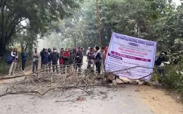 Traffic along the crucial Assam–Agartala National Highway was brought to a complete standstill on Monday morning after three surrendered militant groups launched a joint protest at Baramura’s Hathai Kotor area. The agitation began around 6 am and was organised under the banner of the Tripura Guerrilla Returns Demand Committee, comprising former members of the JAC, JARC and DRMC groups.