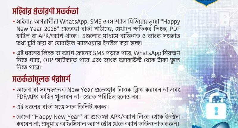 পুলিশ আরও জানিয়েছে, কোনো “হ্যাপি নিউ ইয়ার” বা শুভেচ্ছা সংক্রান্ত এপিকে বা অ্যাপ লিংক থেকে ইনস্টল করা যাবে না। শুধুমাত্র অফিসিয়াল অ্যাপ স্টোর থেকেই অ্যাপ ডাউনলোড করতে হবে।