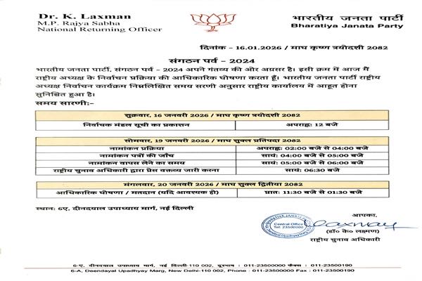According to the notification, the electoral roll for the election was published on January 16. The process of filing nominations will take place on January 19. On the same day, scrutiny of nominations will be conducted, followed by the withdrawal of nominations, if any. In the event that voting becomes necessary, it will be held on January 20 between 11:30 AM and 1:30 PM. The official declaration of results will follow immediately thereafter. All stages of the election process will be conducted at the BJP headquarters located at 6-A, Deendayal Upadhyay Marg, New Delhi.
