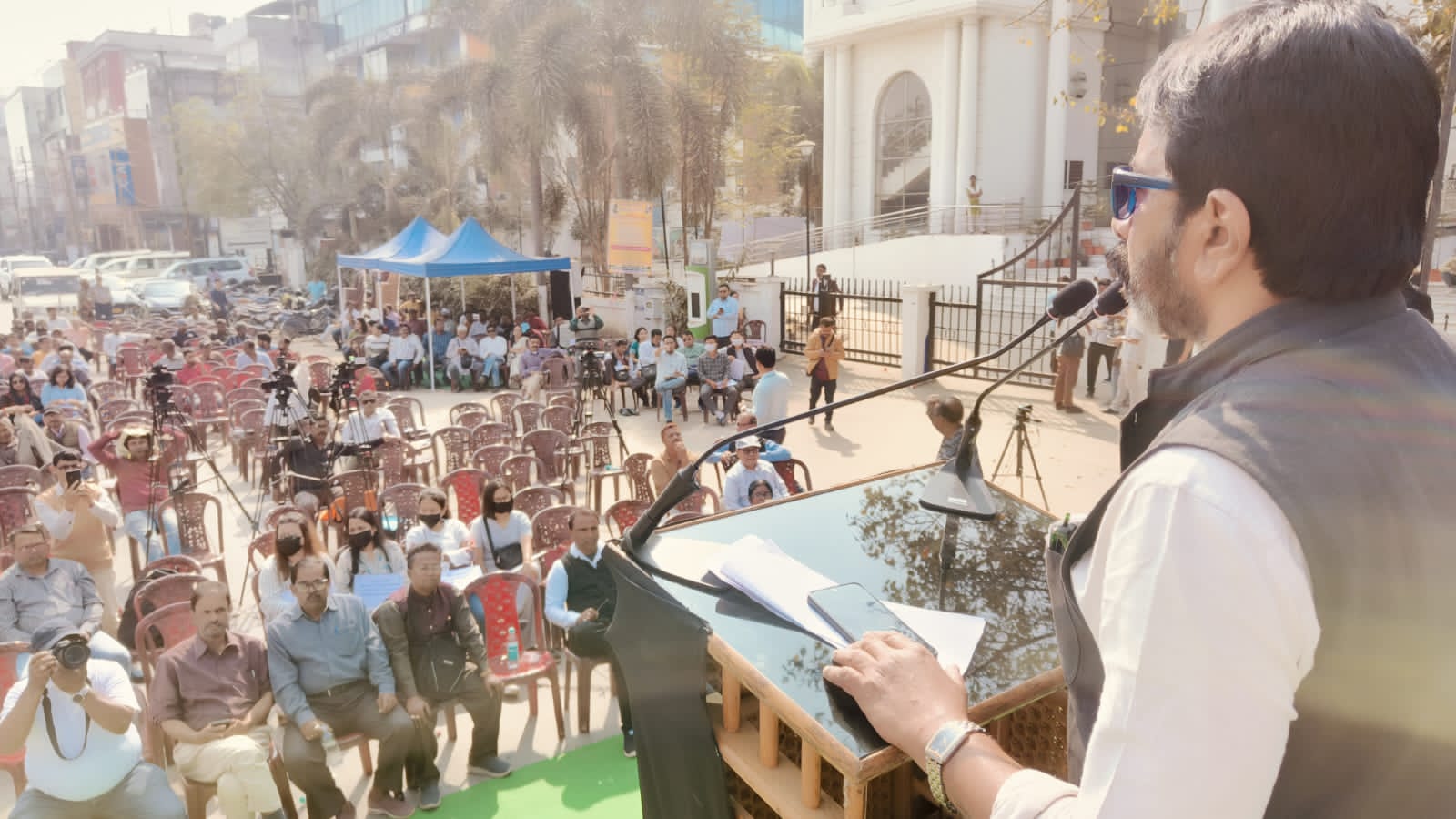 সাংবাদিক ও সংবাদকর্মীদের নিরাপত্তা সুনিশ্চিত করা, আবাসনের জন্য বিনামূল্যে জমি বরাদ্দ, সাংবাদিক কল্যাণ তহবিলে অর্থ বরাদ্দসহ ১১ দফা দাবিতে সোমবার আগরতলার রবীন্দ্রভবনের সামনে তিন ঘণ্টার গণঅবস্থান ও প্রতিবাদ সভা অনুষ্ঠিত হয়।