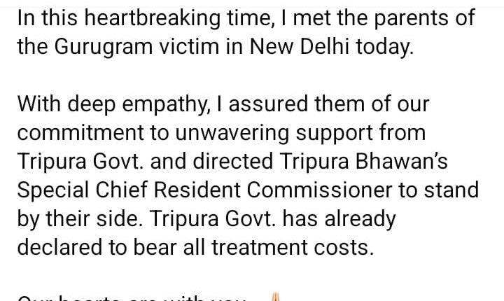 বর্তমানে নয়াদিল্লিতে থাকা মুখ্যমন্ত্রী নির্যাতিতার বাবা-মায়ের সঙ্গে সাক্ষাৎ করেন এবং তাঁদের প্রতি গভীর সমবেদনা জানান। তিনি জানান, এই কঠিন সময়ে ত্রিপুরা সরকার সম্পূর্ণভাবে পরিবারের পাশে থাকবে। পাশাপাশি দিল্লিতে অবস্থিত ত্রিপুরা ভবনের স্পেশাল চিফ রেসিডেন্ট কমিশনারকে অবিলম্বে প্রয়োজনীয় সহায়তার নির্দেশ দেন।