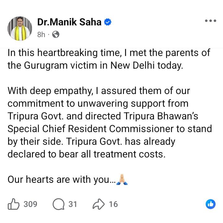 গুরুগ্রামে ১৯ বছরের এক ত্রিপুরার তরুণী নির্যাতনের ঘটনায় নির্যাতিতার পরিবারের পাশে থাকার আশ্বাস দিলেন ত্রিপুরার মুখ্যমন্ত্রী মানিক সাহা।