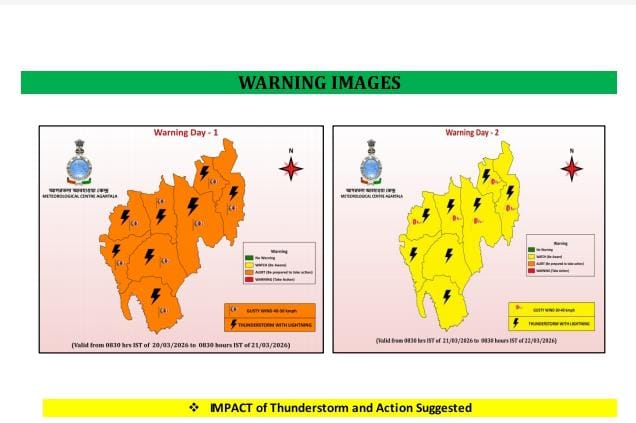 ত্রিপুরার বিভিন্ন জেলায় আগামী দুই দিন বজ্রবিদ্যুৎ সহ ঝড়ো হাওয়া ও বৃষ্টির সম্ভাবনার কথা জানিয়েছে আগরতলা আবহাওয়া দপ্তর। দপ্তরের পূর্বাভাস অনুযায়ী, ২০ ও ২১ মার্চ রাজ্যের একাধিক জেলায় ৩০ থেকে ৫০ কিলোমিটার বেগে দমকা হাওয়ার সঙ্গে বজ্রঝড় এবং হালকা থেকে মাঝারি বৃষ্টি হতে পারে।