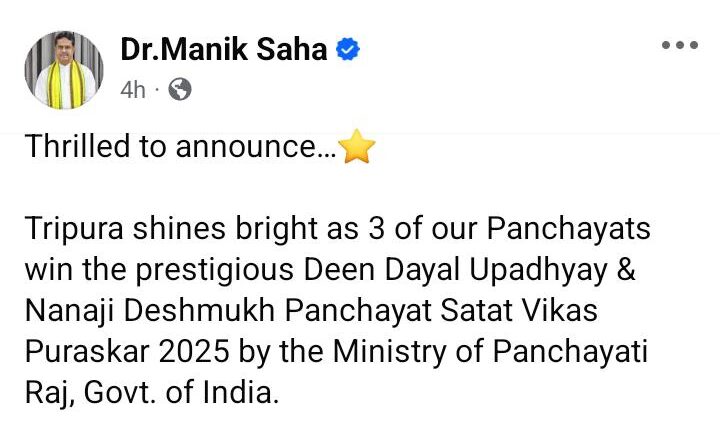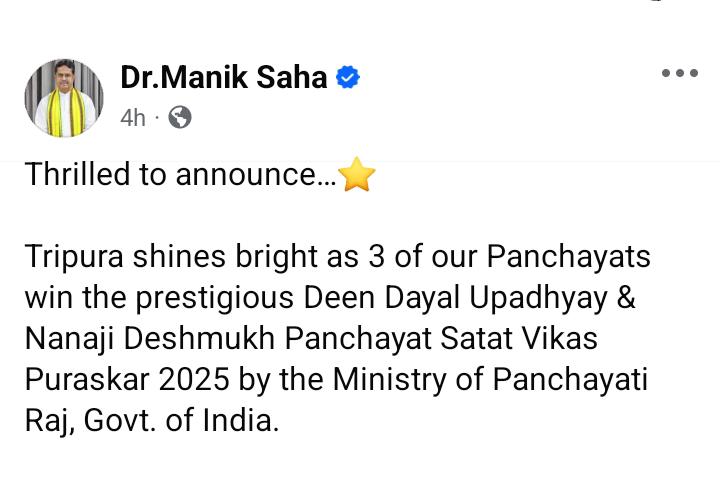 ফের জাতীয় স্তরে সম্মান অর্জন করল ত্রিপুরার পঞ্চায়েত রাজ ব্যবস্থা। ২০২৫ সালে বিভিন্ন বিভাগে উল্লেখযোগ্য কাজের স্বীকৃতিস্বরূপ রাজ্যের তিনটি পঞ্চায়েত জাতীয় পুরস্কারে ভূষিত হয়েছে। কেন্দ্রীয় পঞ্চায়েতি রাজ মন্ত্রকের পক্ষ থেকে ৩০ মার্চ ২০২৬ তারিখে জারি করা এক নির্দেশে রাজ্য সরকারকে এই সাফল্যের কথা জানানো হয়।
