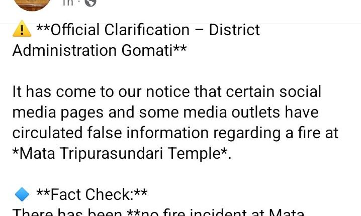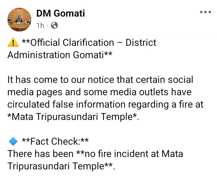 উদয়পুরের ত্রিপুরেশ্বরী মন্দির-এ আগুন লেগেছে, রবিবার সকালে সামাজিক মাধ্যমে একটি ভিডিও ঘিরে ছড়িয়ে পড়ে এই খবর। এই খবরকে সম্পূর্ণ ভুয়া ও বিভ্রান্তিকর বলে দাবি করছে গোমতী জেলা প্রশাসন।